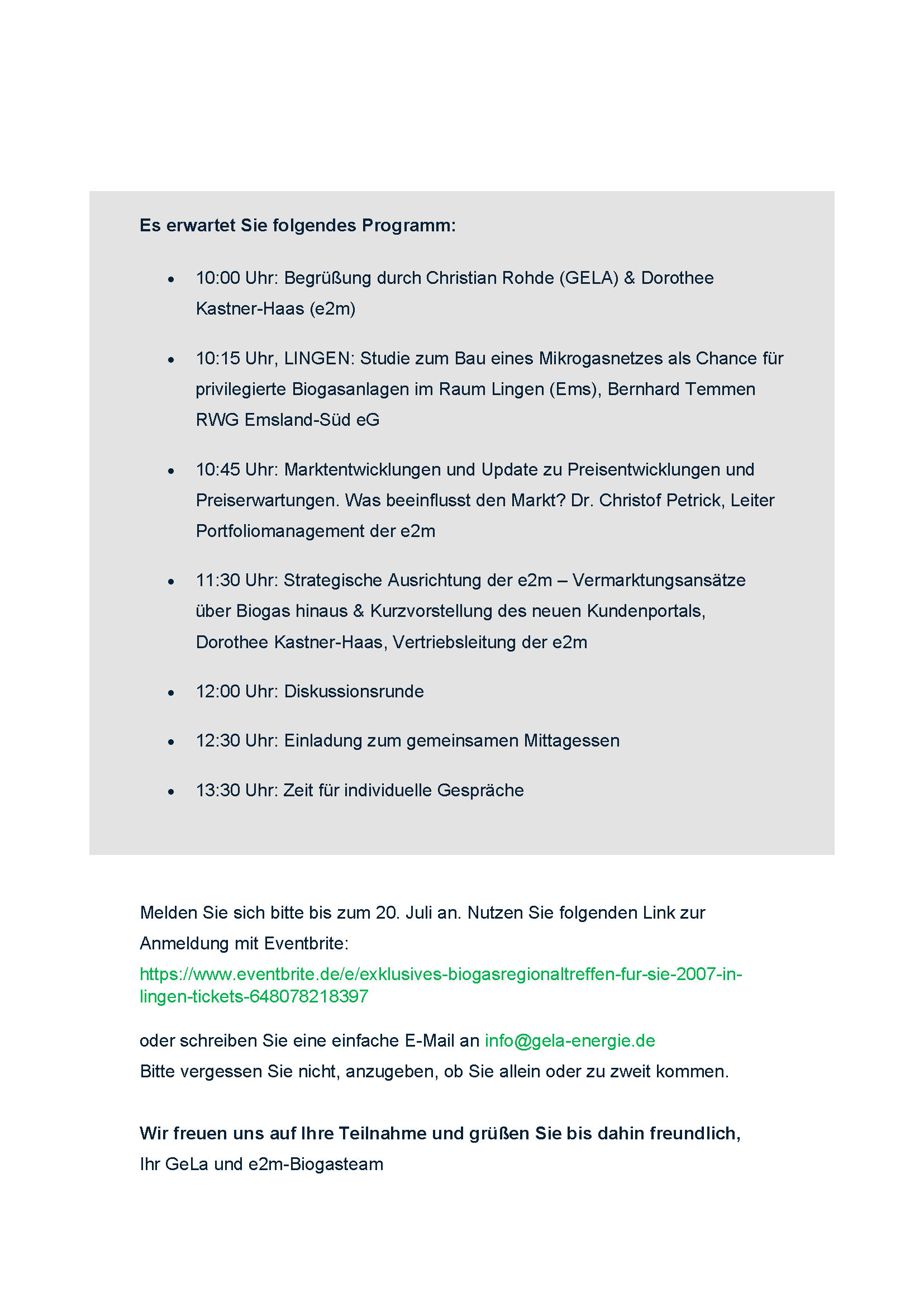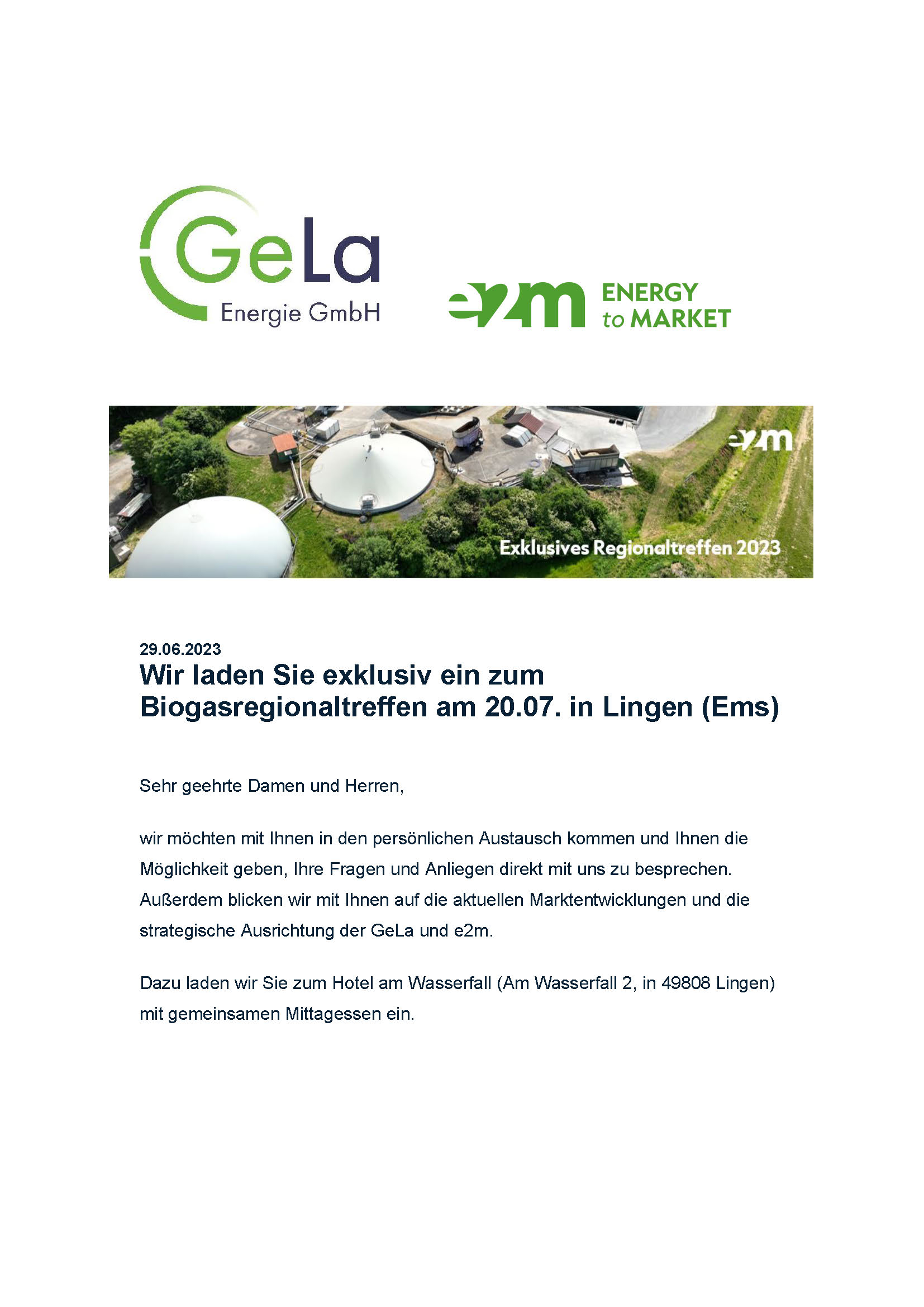 wir möchten mit Ihnen in den persönlichen Austausch kommen und Ihnen die Möglichkeit geben, Ihre Fragen und Anliegen direkt mit uns zu besprechen. Außerdem blicken wir mit Ihnen auf die aktuellen Marktentwicklungen und die strategische Ausrichtung der GeLa und e2m.