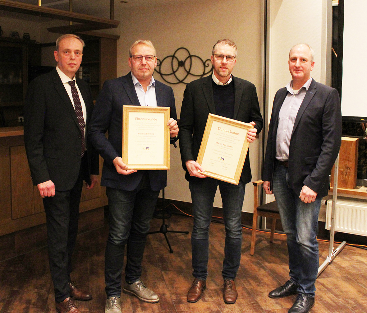 Für 25-jährige Tätigkeit im Aufsichtsrat bekamen Helmut Berning und Martin Hackmann die Silberne Ehrennadel des Deutschen Genossenschafts- und Raiffeisenverbandes;