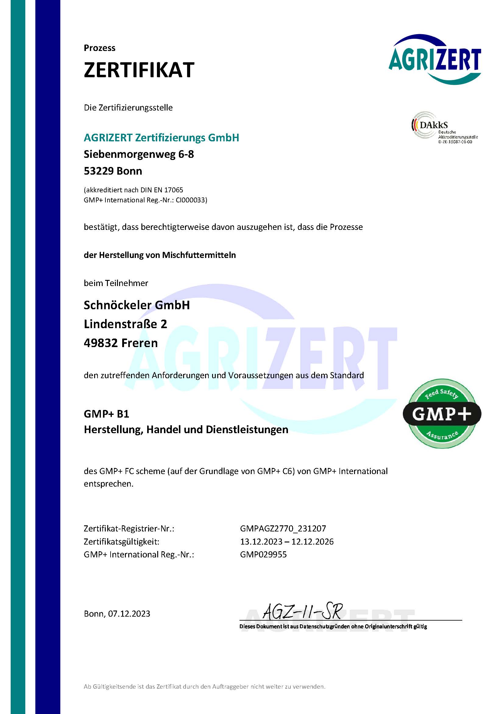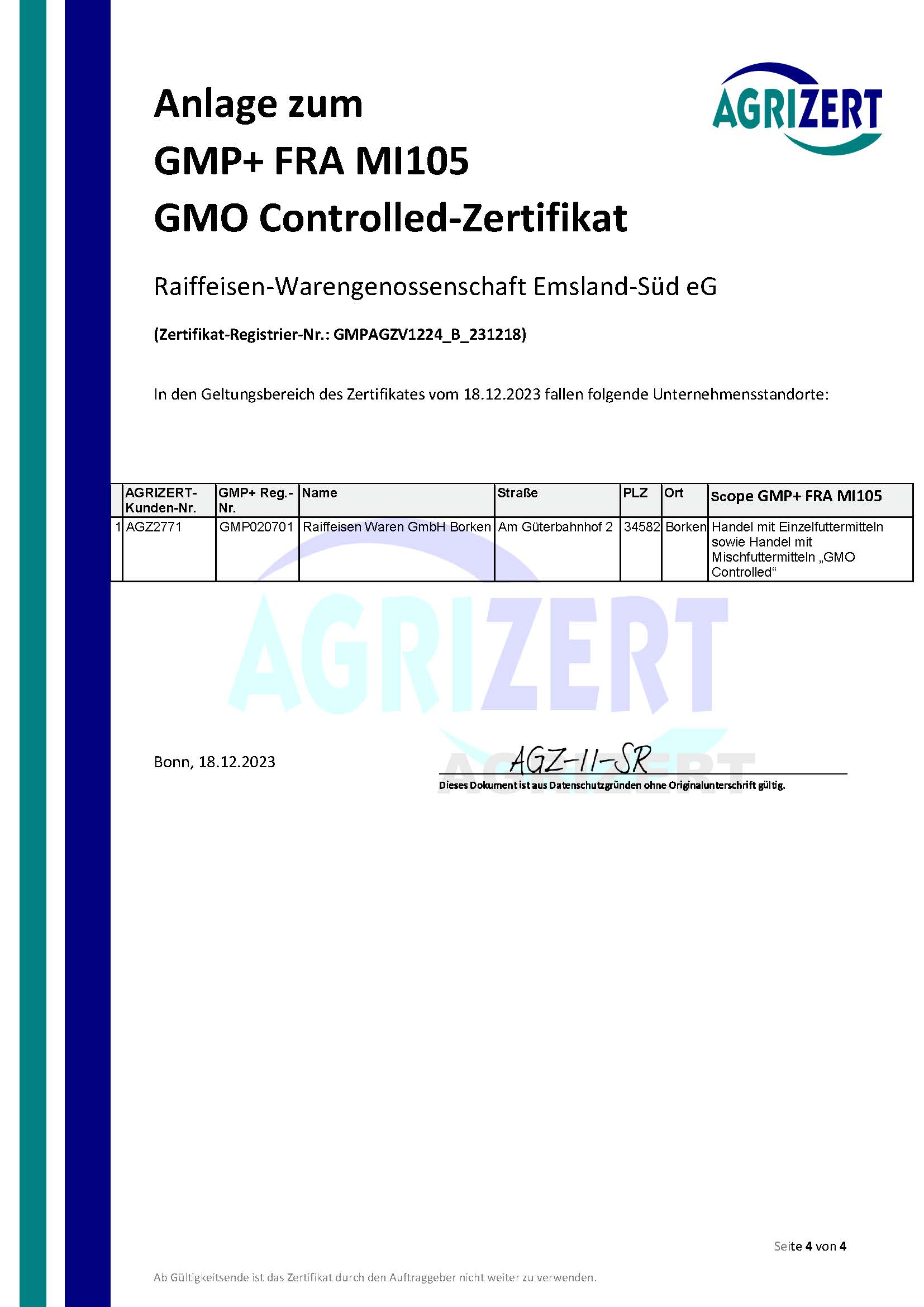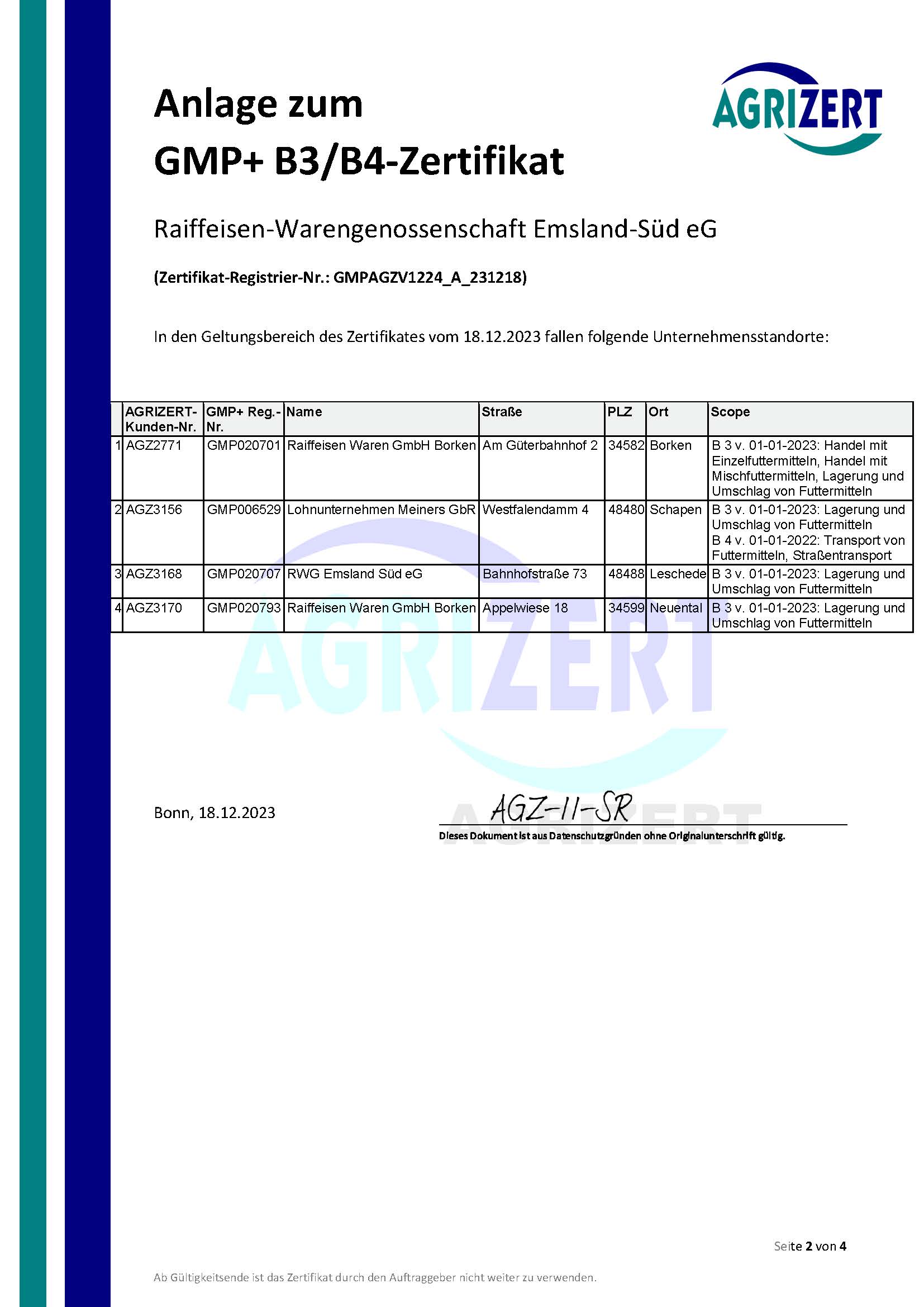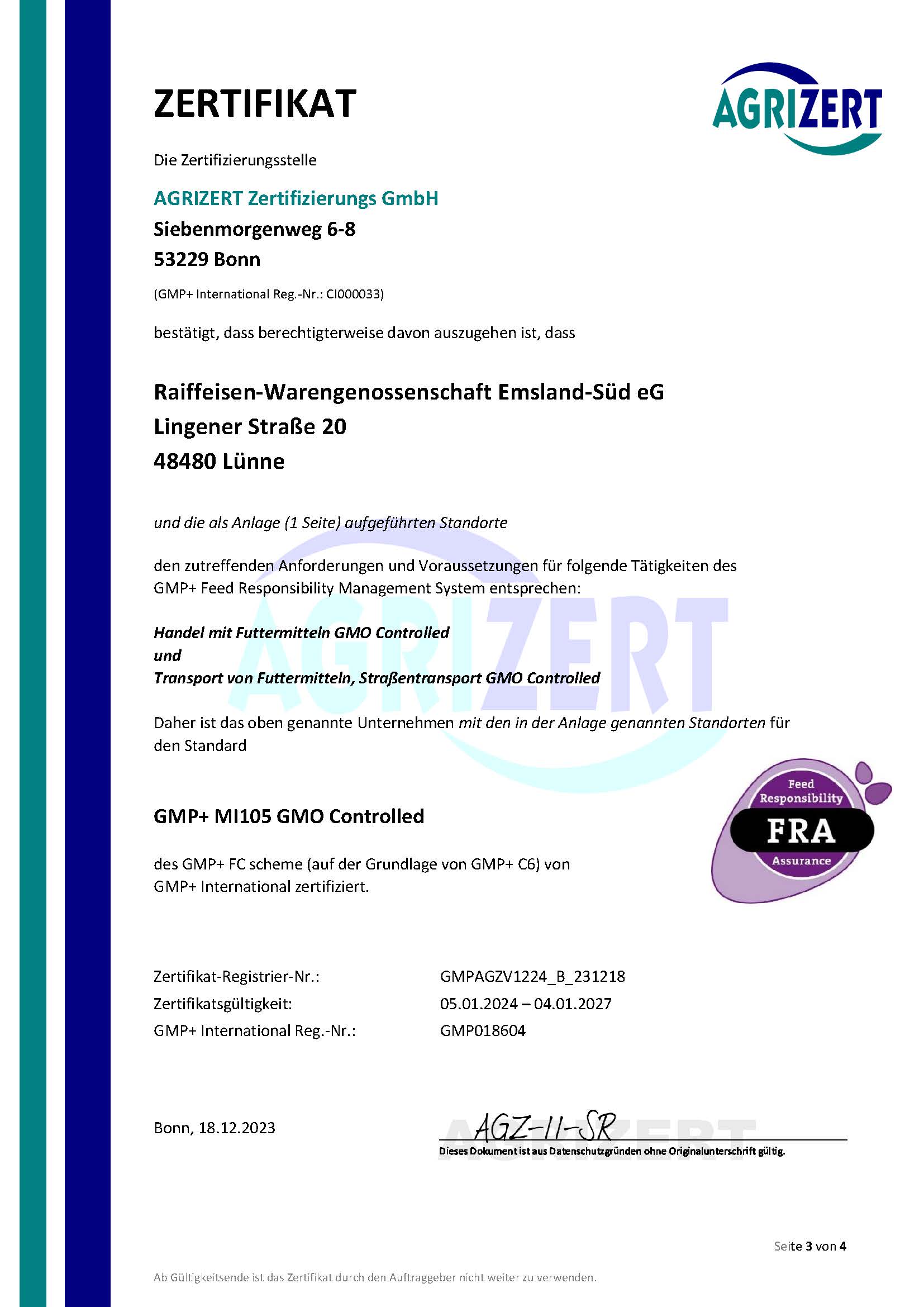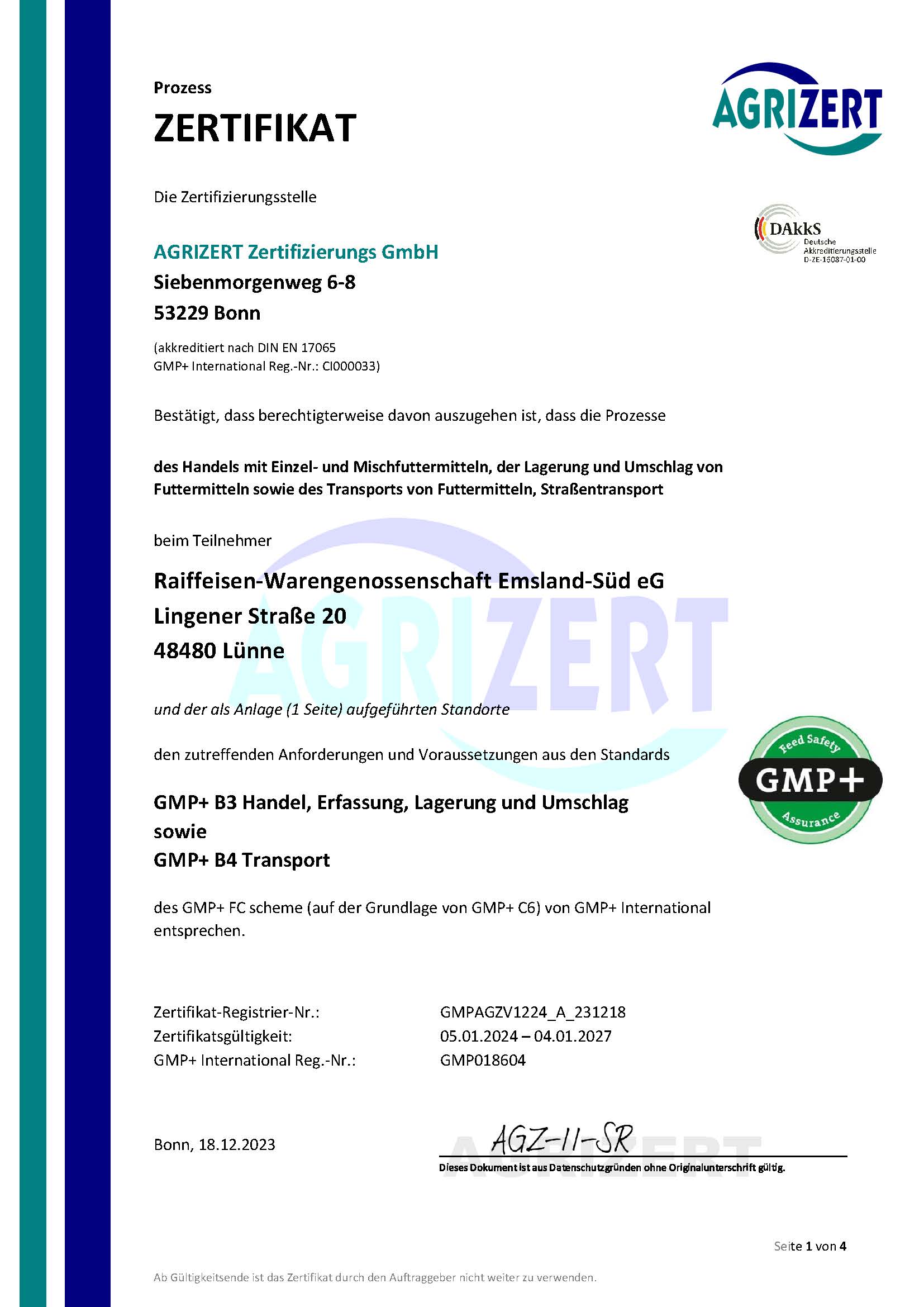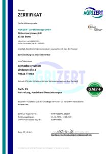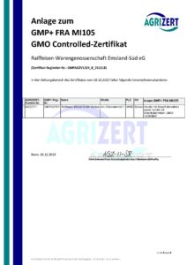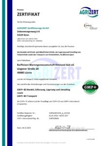 Seit dem Jahr 2001 sind wir nach den GMP-Standards B2, B4.1 und B1 zertifiziert. Die Zertifizierung umfasst die Lagerung und den Transport von Futter und Getreide. Eine jährliche Überprüfung sorgt für die Einhaltung der Kriterien.
