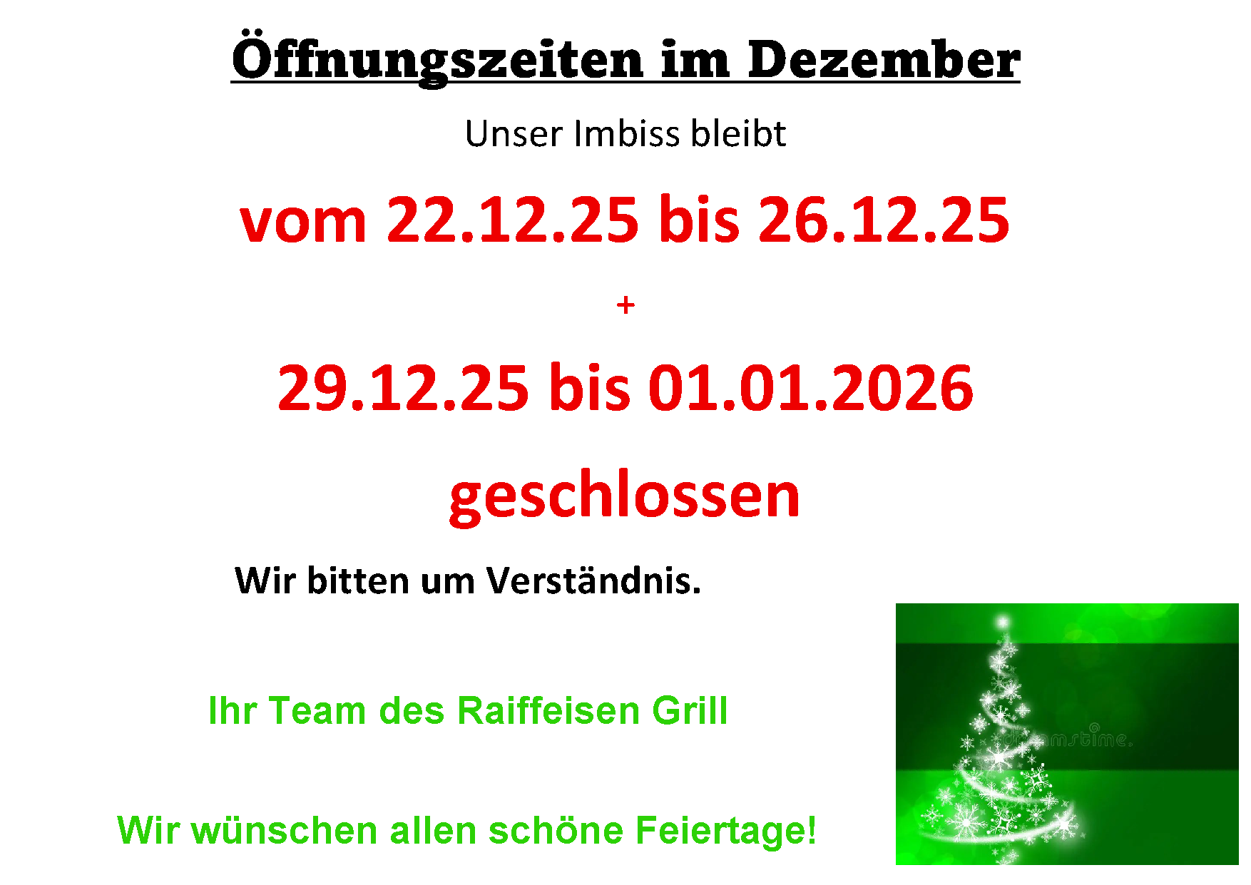 Bestellungen im Haus bis 30 min. vor Schließung.