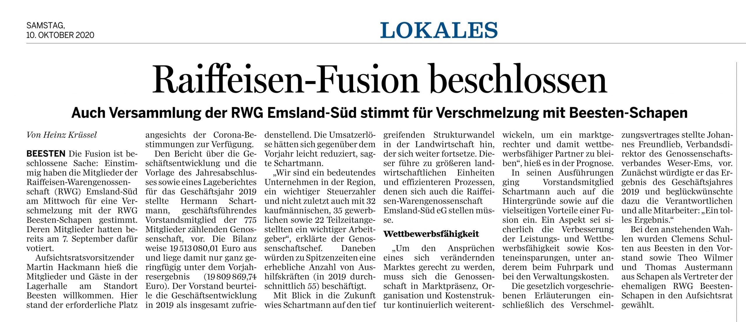 Auch Versammlung der RWG Emsland-Süd stimmt für Verschmelzung mit Beesten-Schapen!